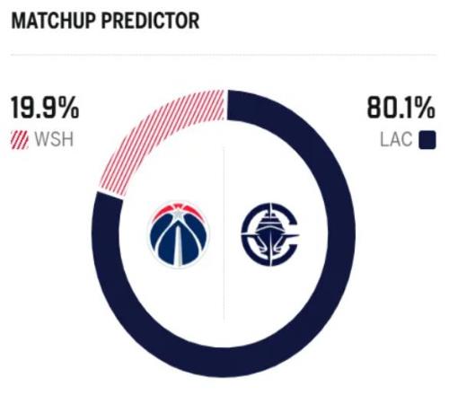 赛前,美媒ESPN对本场比赛进行了胜率预测,快船队胜率为80.1%,奇才胜率则仅有可怜的19.9% ,差距太明显了。