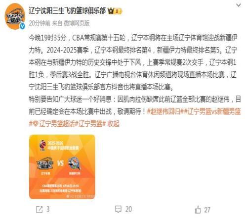 本赛季首次辽疆大战,赵继伟复出的表现令人期待,他能否率队取胜值得关注。