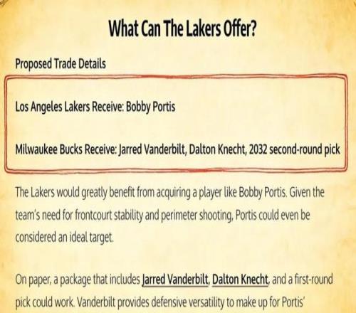 美媒《Fadeaway World》撰文建议,湖人应该打包送出范德比尔特、克内克特以及2032年的首轮签,从雄鹿引入波蒂斯。