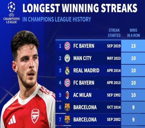 北京时间1月23日,德转统计出了欧冠历史连胜场次TOP10,本赛季联赛阶段7战全胜的阿森纳并列第10位,拜仁慕尼黑以1...