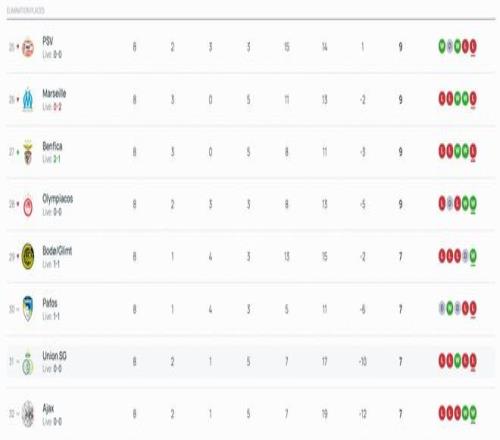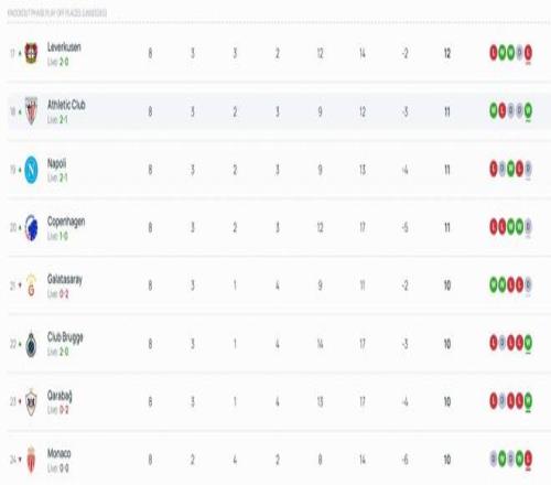 北京时间1月29日,欧冠联赛阶段最后一轮18场比赛全部结束了上半场的争夺。上半场结束后,曼城进入前八名,切尔西掉出前八名。西甲双雄皇马、巴萨目前都暂时落后,分别掉至第5和第13。