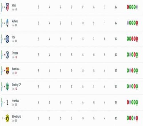 欧冠末轮半场后积分榜:曼城顶替切尔西进入前8,皇马第5巴萨第13
