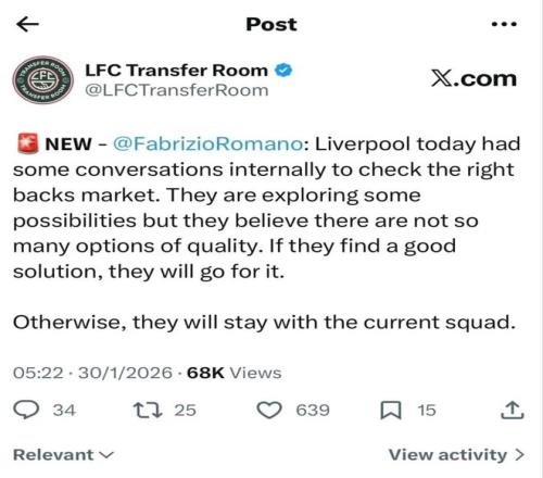 罗马诺:利物浦昨天在内部碰了一下,想看看右后卫的市场。他们正在探索一些可能性,但认为有质量的选择不多。如果能找到一个好的解决方案,他们就会去做。否则,利物浦将保持现有阵容。