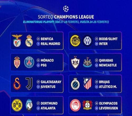 注:根据欧足联规则,联赛阶段排名靠前的球队(第9–16名)将在次回合主场作战。因此上述对阵中,皇马、国米、巴黎、纽卡、尤文、马竞、亚特兰大、勒沃库森均将在第二回合坐镇主场。