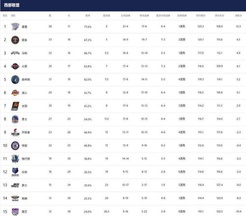 1-3名:雷霆(38胜11负)、掘金(33胜16负)、马刺(32胜16负)