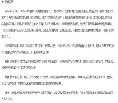 与此同时,CBA还以“本赛季CBA联赛赛风赛纪责任人制度相关规定”,分别对双方教练王世龙和杨城分别追加处罚人民币1万元。
